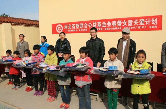 2016年10月29日,2016新联合春蕾女童关爱计划捐赠仪式在行唐县城寨乡上滋洋小学顺利举行,为该项目2016年度划上了圆满的句号。新联合公益基金会秘书长段聪丽、瑞安基金总裁杨锐、石家庄电台106.7音乐广播活动部项目主管王全及社会爱心人士带着善款和物资来到行唐县城寨乡,为50名贫困女童每人带来1000元现金和价值220元的文体用品。城寨乡有关领导和省工经联(省经团联)驻寺头村工作组全程参与。